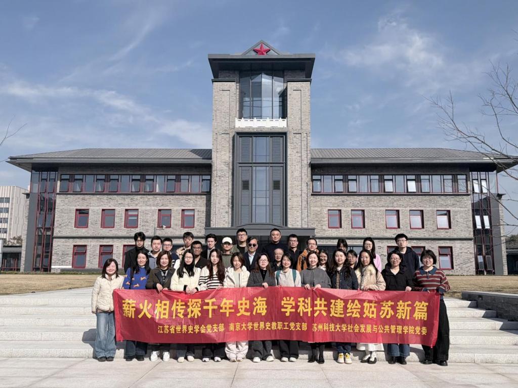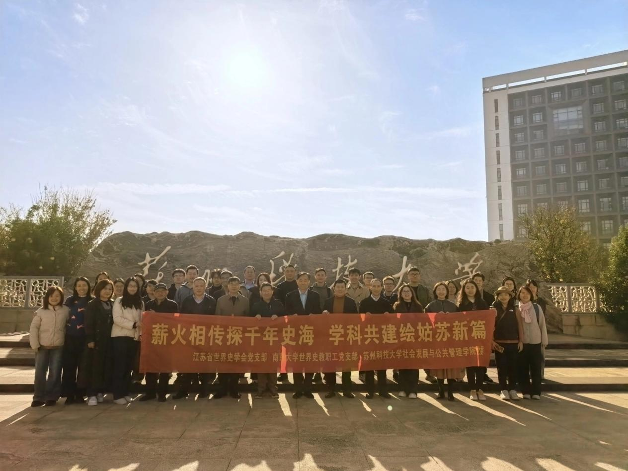 2025年11月30日,苏州科技大学社会发展与公共管理学院党委、江苏省世界史学会党支部、南京大学历史学院世界史党支部以“薪火相传探千年史海 学科共建绘姑苏新篇”为主题,联合开展党员共建活动,共同参观南京大学苏州校区。社会发展与公共管理学院党委书记夏新广、院长王本立,江苏省世界史学会会长、支部书记刘成,南京大学世界史教职工党支部书记吴贺以及三家党组织的部分党员同志参加活动。